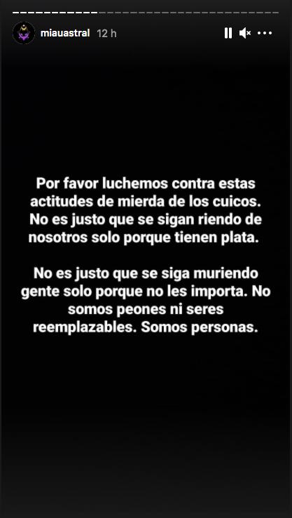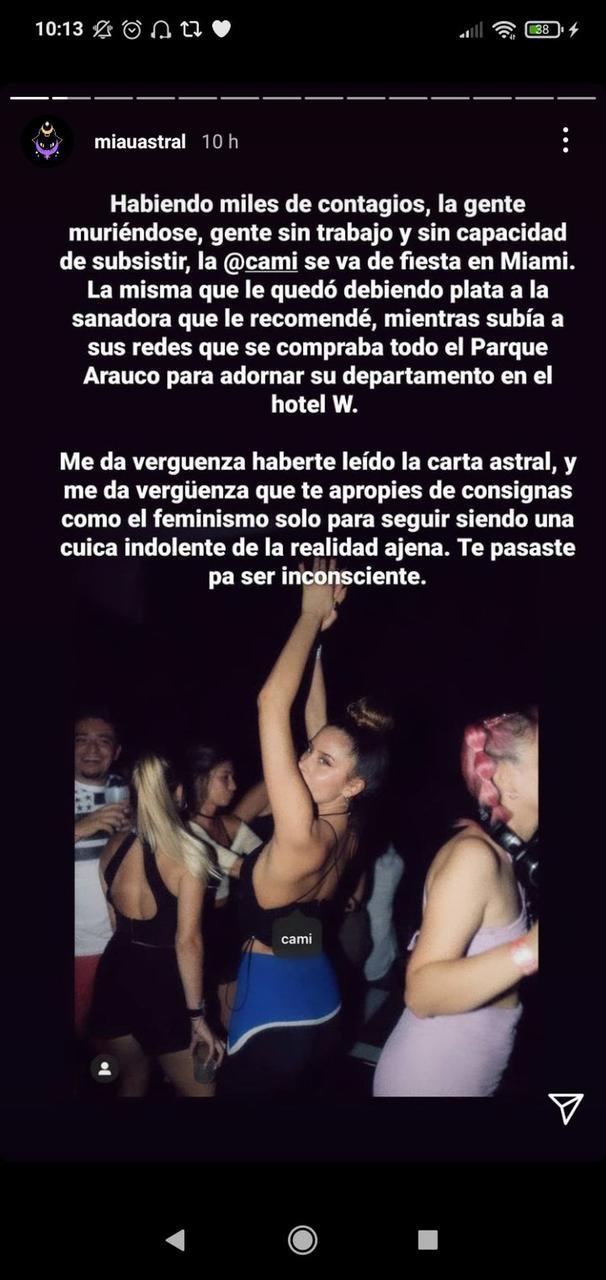 "Habiendo miles de contagios, la gente muriéndose, gente sin trabajo y sin capacidad de subsistir, la @cami se va de fiesta en Miami", escribió en un comienzo Consuelo, para luego revelar una impactante indormación.
