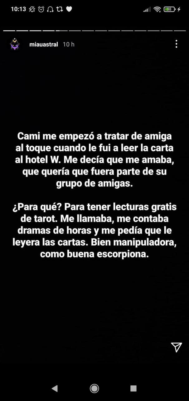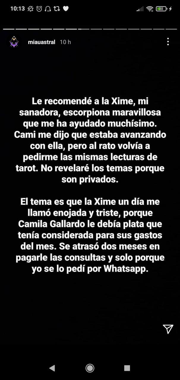 "Me llamó la Xime (la sanadora) enojada y triste porque Camila Gallardo le debía plata que tenía considerada para sus gastos del mes. Se atrasó dos meses en pagarle las consultas y solo porque yo se lo pedí por WhatsApp", recalcó la joven.