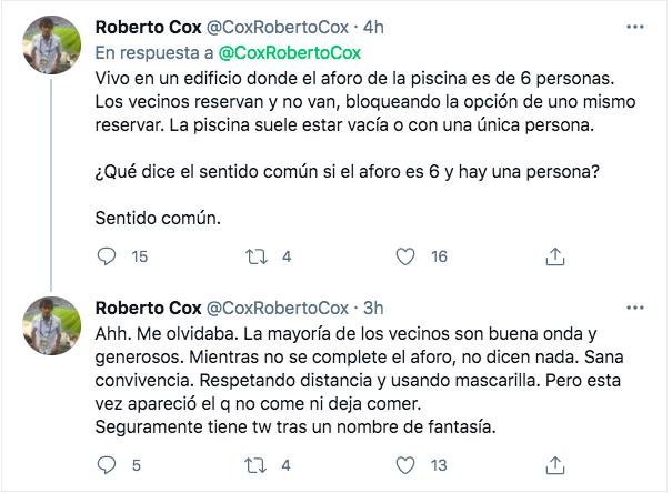 Este fin de semana Roberto compartió su pensamiento sobre los vecinos de su edificio. Todo sobre la utilización de la piscina, la cual se debe hacer con reserva debido a la pandemia del coronavirus.