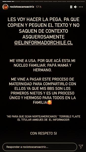 A través de stories de su cuenta de Instagram, Rocío Toscano, respondió furiosa y aclaró varios temas, incluída la nacionalidad de su pololo.