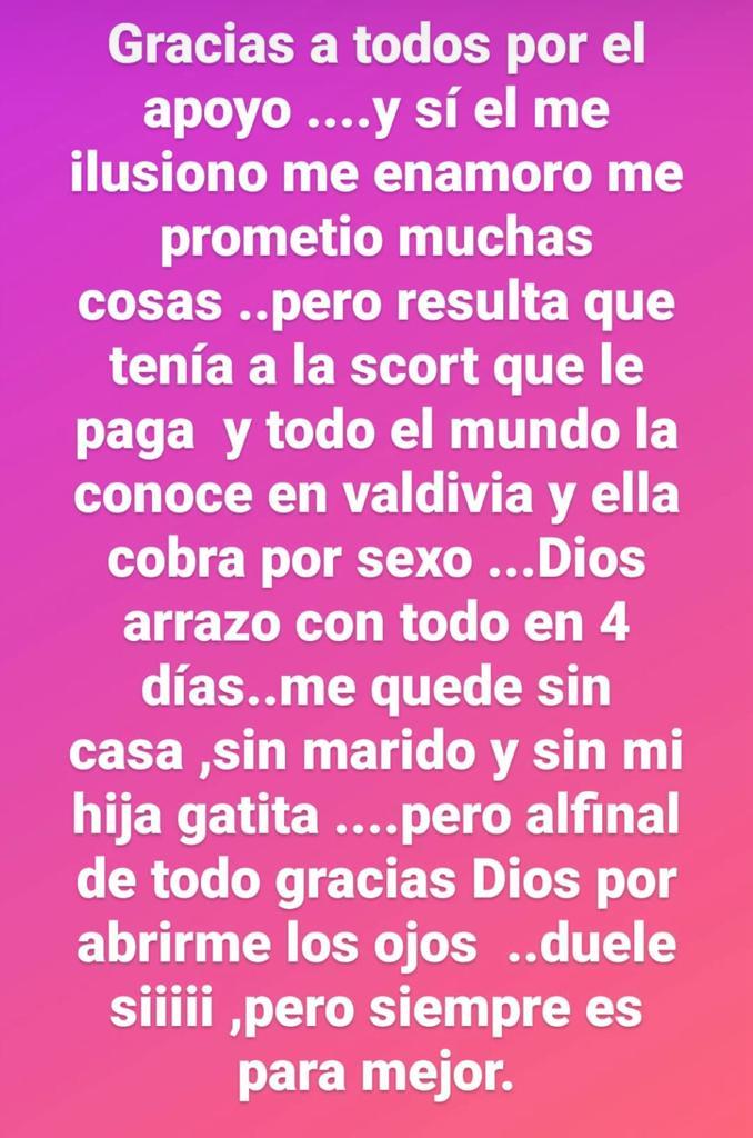 Asimismo, Rosemarie usó su plataforma digital para aclarar lo sucedido con Cristóbal, empresario que era su pareja desde hace años y que le habría sido infiel. “Gracias a todos por el apoyo…y sí él me ilusionó, me enamoró, me prometió muchas cosas…Pero resulta que tenía a la scort que le paga y todo el mundo la conoce en Valdivia y ella cobra por sexo”, reveló, agregando que “Dios arrasó con todo en 4 días…Me quedé sin casa, sin marido y sin mi hija gatita…Pero al final de todo, gracias a Dios por abrirme los ojos…duele, sí, pero siempre es para mejor”.