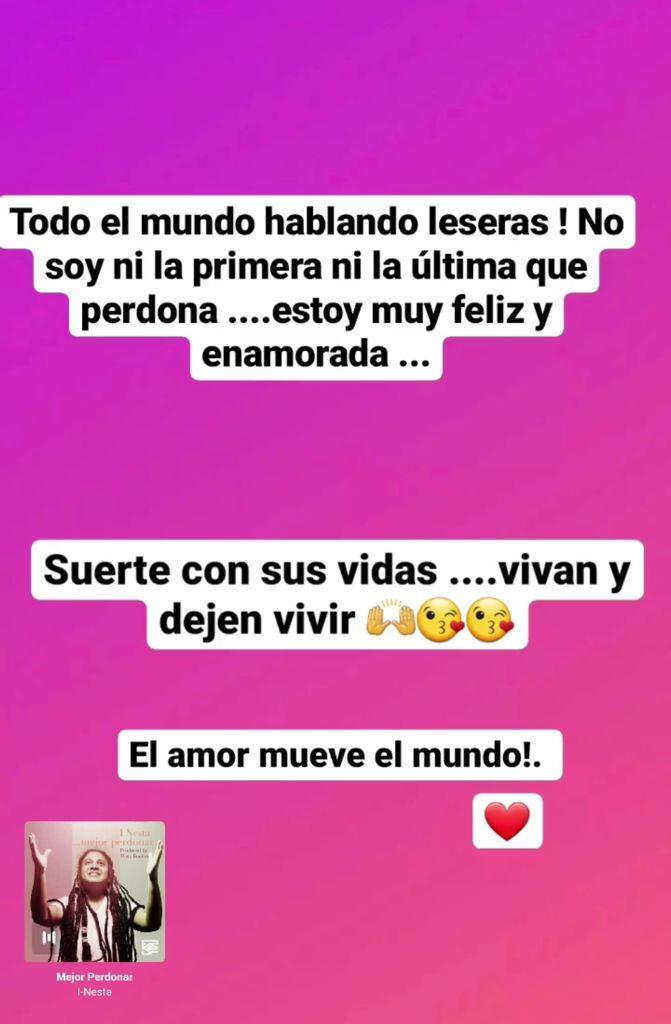 “Todo el mundo hablando leseras. No soy ni la primera ni la última que perdona”, afirmó Rosemarie en un posteo que compartió este miércoles. “Estoy muy feliz y enamorada”, destacó Dietz, quien aprovechó de aconsejar a quienes la han criticado con dureza por su decisión. “Suerte con sus vidas…Vivan y dejen vivir...El amor mueve el mundo”, finalizó la ex participante de programas como “Pelotón” y “Amazonas”.