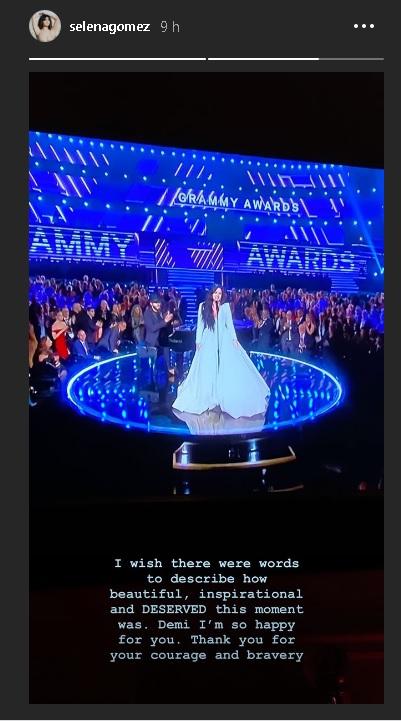 “Desearía que hubieran palabras para describir lo hermoso, inspiracional y merecido que fue este momento. Demi estoy muy feliz por ti. Gracias por tu coraje y valentía”, escribió Gomez a través de Stories de Instagram.