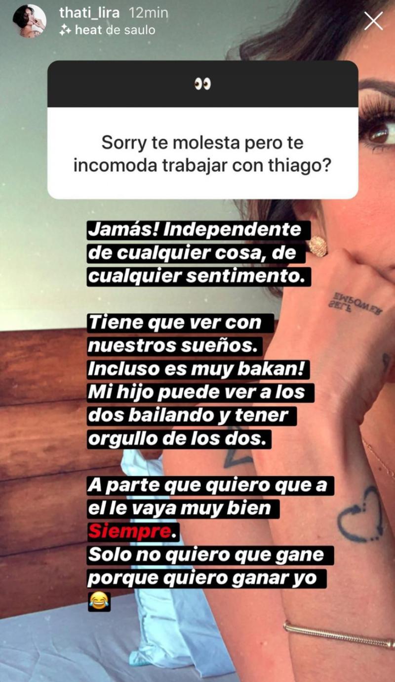 Hace unos días Thiago Cunha conversó con AR13 y se sinceró sobre la buena relación que tiene con su ex Thati Lira precisamente ahora que les tocó trabajar juntos en “Bailando por un Sueño”. “Es bacán, es bonito, estoy muy feliz por ella, soy hincha de ella. Se veía espectacular de linda y espero que le vaya muy bien”, expresó.