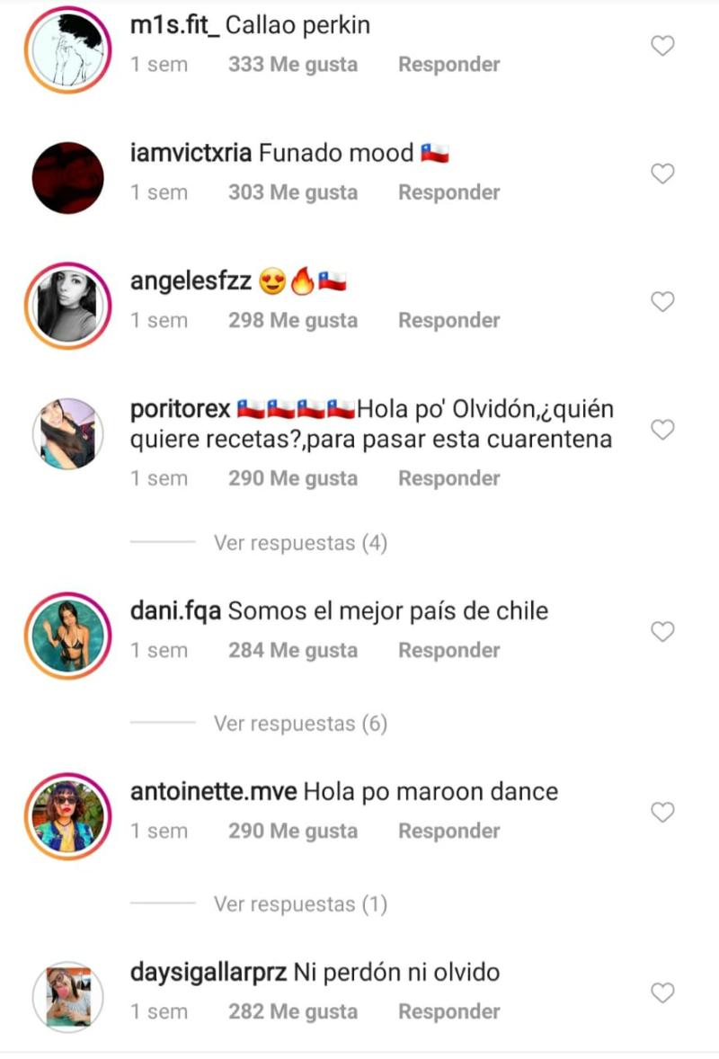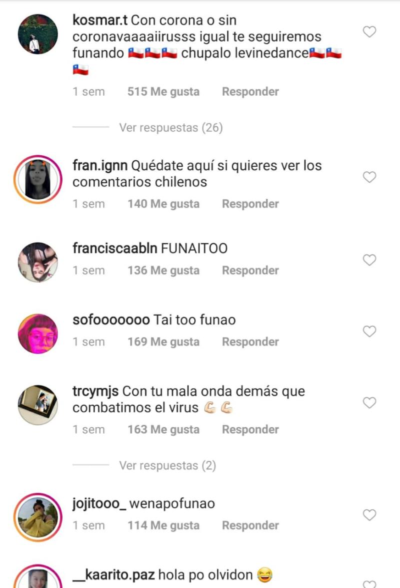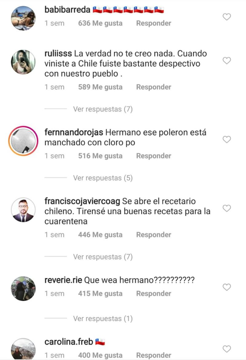 En su última imagen, compartida el 21 de marzo, el cantante habla sobre la importancia de cuidarse en tiempos de coronavirus, y aunque hay respuestas que aluden al tema, la gran mayoría corresponden a compatriotas haciendo presencia con distintos tipos de comentarios, que van desde insultos, hasta recetas o letras de canciones, sólo para hacerle saber que los chilenos no olvidan.