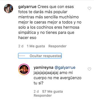 Ante esto Yamila no se quedó callada y respondió: "Amo mi cuerpo. "No me avergüenzo ¿Tú sí?", ganando el apoyo de sus seguidores.