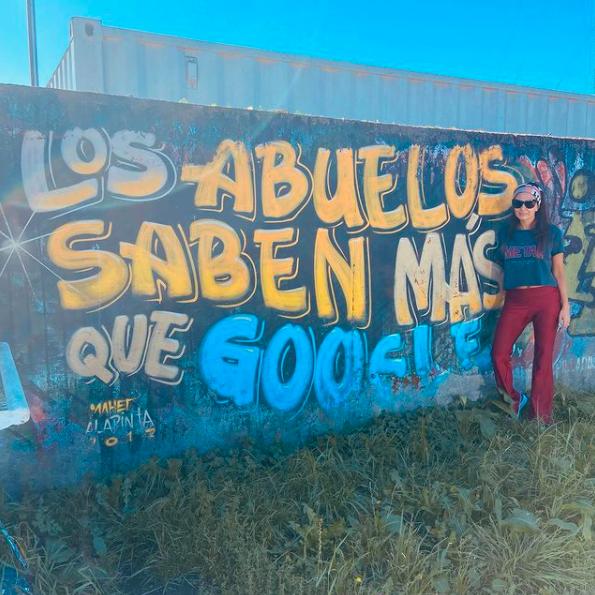 Hace algunos días Yazmín Vásquez publicó una fotografía donde posa junto a un mural que hace referencia a la experiencia de las personas de la tercera edad.