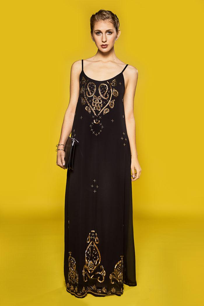 Puedes optar por un sexy look de shorts con top y encima una ligera chaqueta corta con brillo y bordados, o bien puedes irte a la segura con la elegancia de un vestido negro largo y con aplicaciones en dorado.