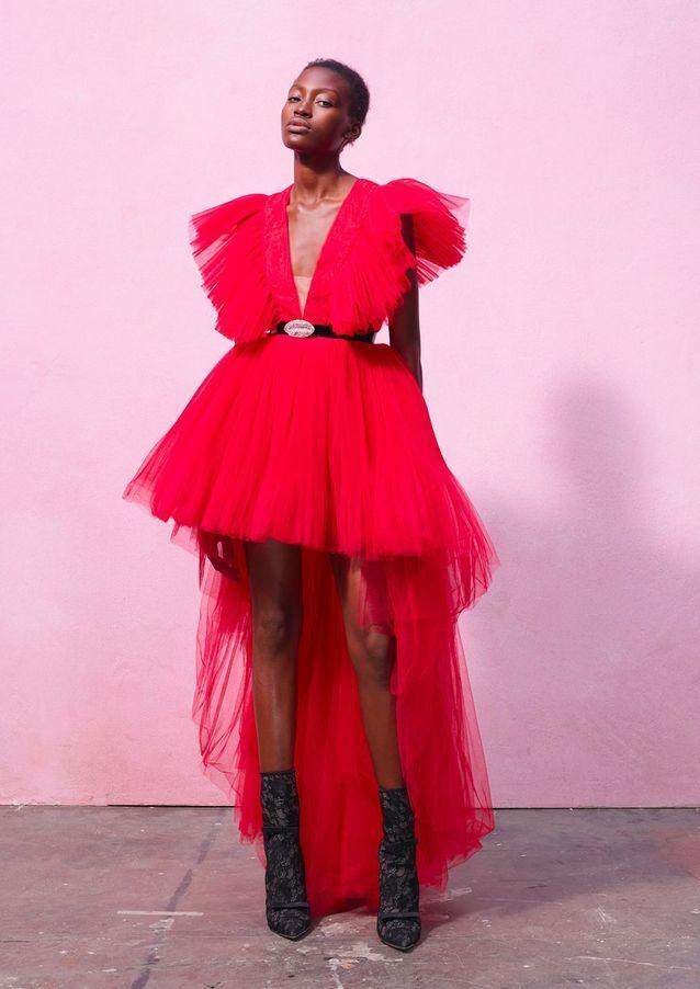 El pomposo diseño rojo corte asimétrico luce tanto en la artista y en la súper modelo en tiempos donde cualquier mujer de baja estatura se cuestionaría llevarlo por una ecuacuación sencilla: 1.79 vs 1.54 metros de altura.
