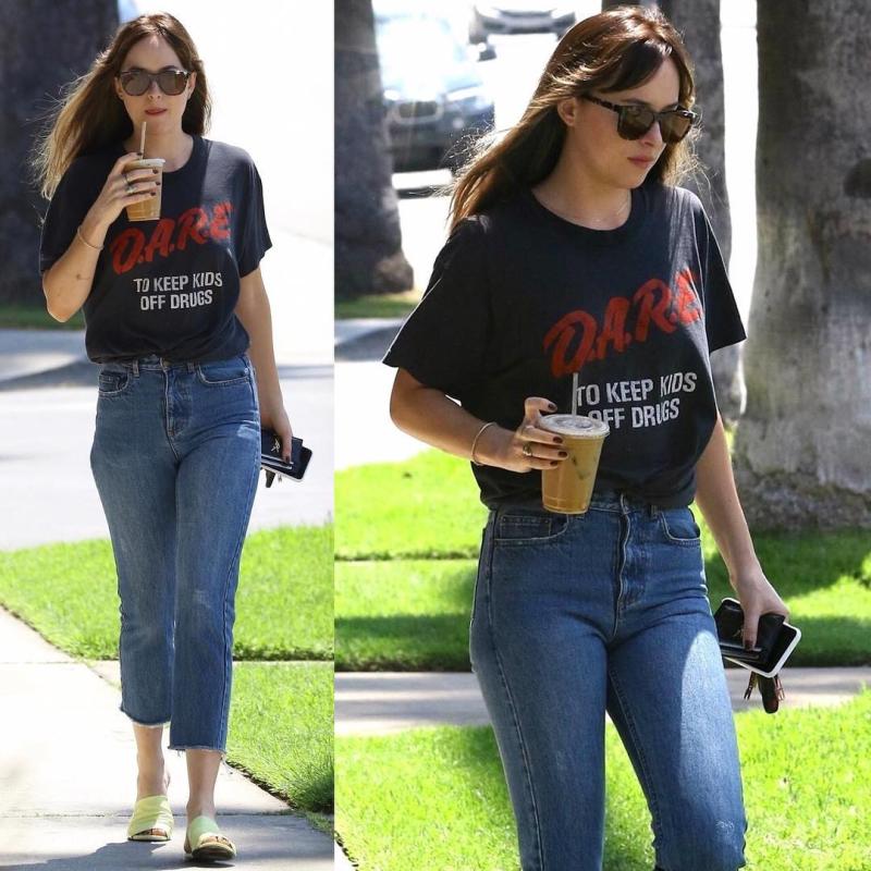 Dakota Johnson muy noventera con sus sandalias flúor...