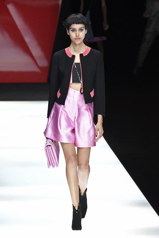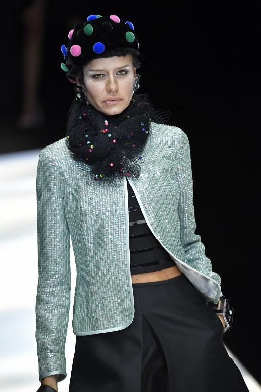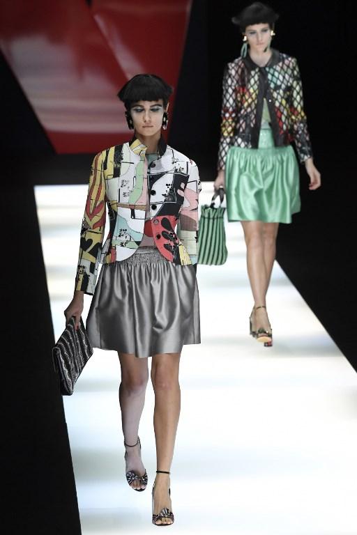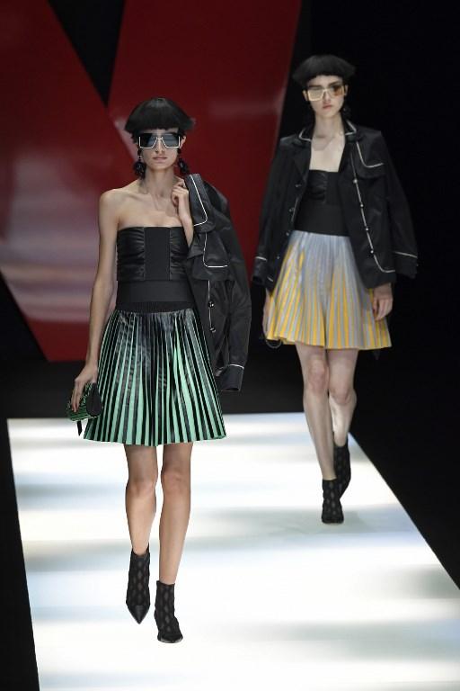 Las chaquetas llevan dobladillos asimétricos, las faldas son plisadas y brillantes, todo fiel a la "elegancia lineal y sofisticada de Armani", sostienen los expertos.