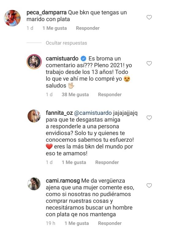 "Me da vergüenza ajena que una mujer comente eso, como si nosotras no pudiéramos comprar nuestras cosas", aseguró otra persona, a la que Cami Stuardo respondió.