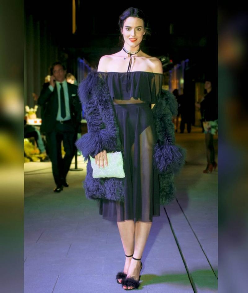 De pies a cabeza Renata se lució con la tendencia de las sandalias peludas, debajo de su atuendo lució un calzón tiro alto a tono y encima se puso un abrigo peludo obedeciendo a la propuesta de usarlos a medio poner, de tal forma que se luzcan los hombros y otros detalles de su primaveral look de noche.