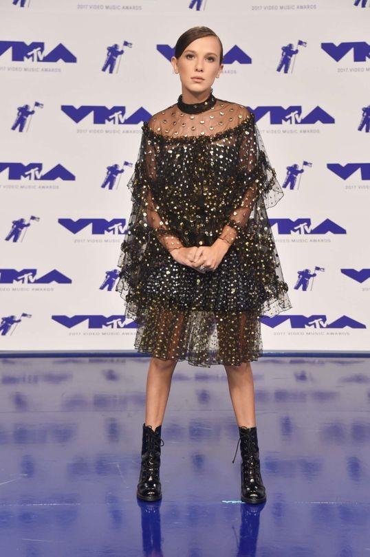 3- Millie Bobby Brown en los VMAs con un Rodarte de transparencias, vuelos y bototos