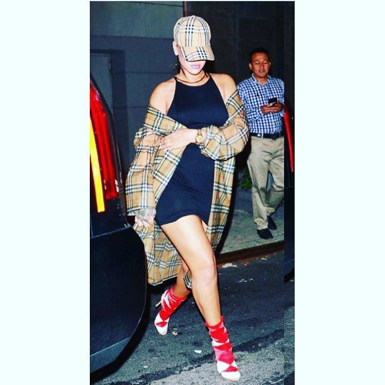Mucho Burberry, sandalias y calcetines: el excesivo look de Rihanna