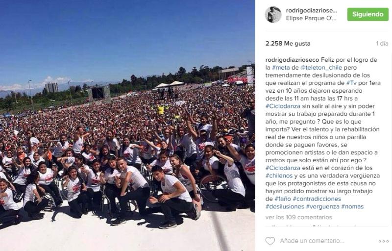 Se logró la meta con creces. Sin embargo, no todos terminaron felices con lo ocurrido en la Teletón 2016. Tal es el caso del bailarín Rodrigo Díaz, quien demostró su decepción con la transmisión televisiva de la cruzada solidaria.