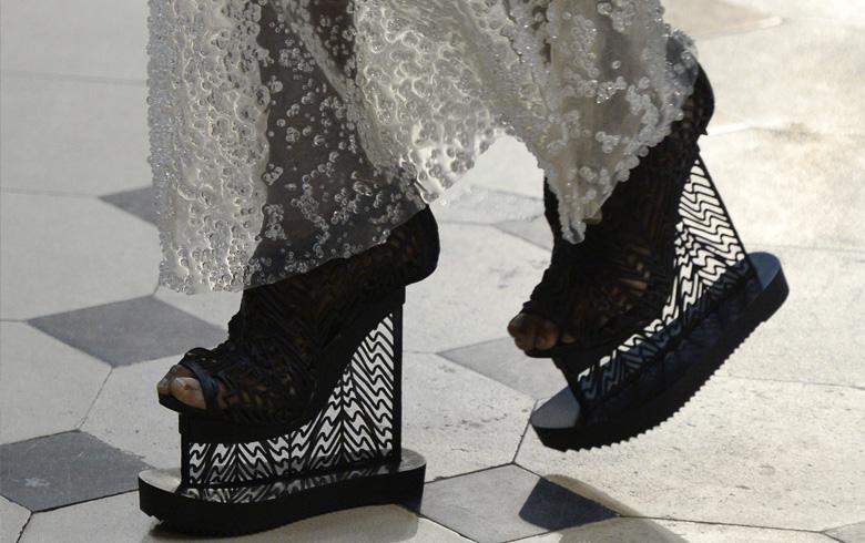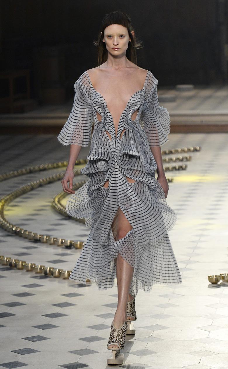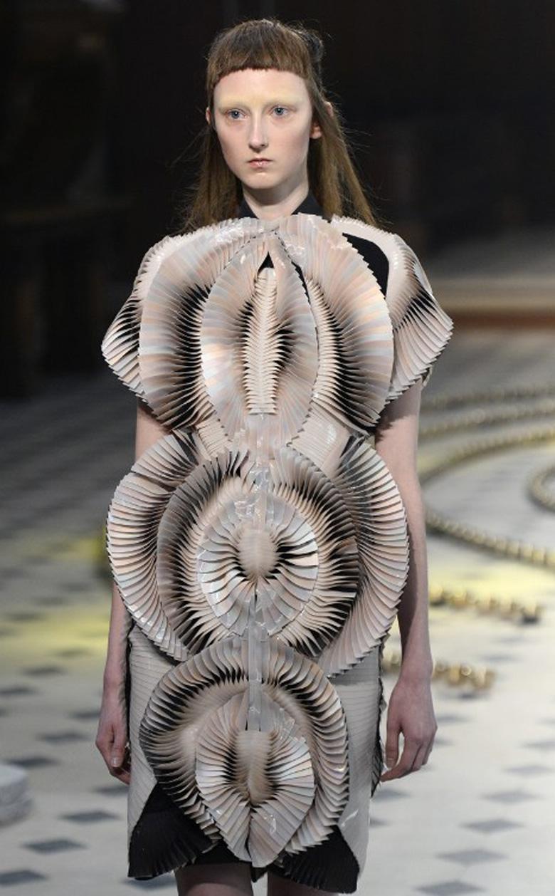 Iris van Herpen, en cambio, apostó por una recopilación de vestidos totalmente fuera de dimensión y una paleta de colores neutras como gris, negro, beige y blanco, además de los transgresores zapatos que mostró en la pasarela.