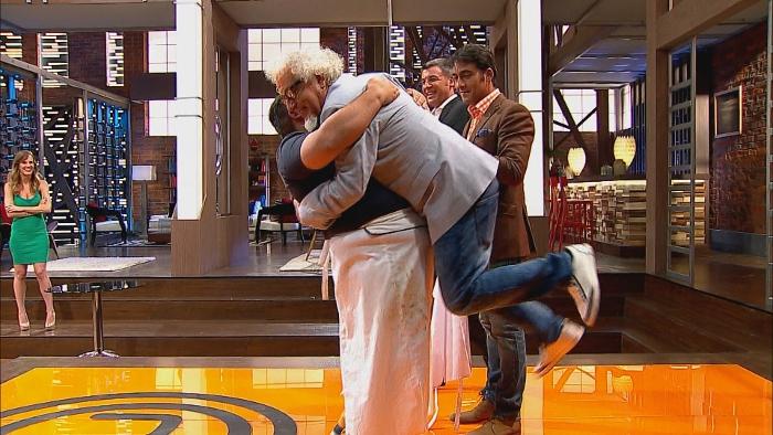 Este bombero recibió el último delantal, y extremadamente emocionado, celebró abrazando y levantando a todos los jurados. Incluso lo intentó con Diana, pero no tuvo éxito.