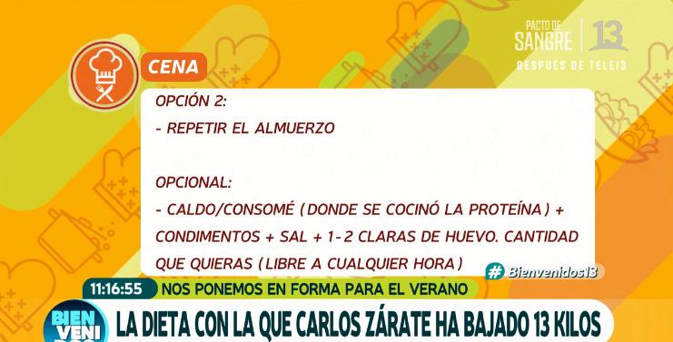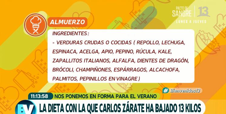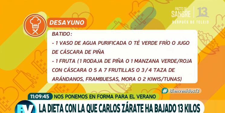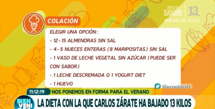 Zárate bajó 18 kilos, lo que lo tiene a gusto, tanto así que compartió su secreto junto a la especialista Catalina Silva, quien aseguró que su paciente fue muy "mateo". La primera semana fue de desintoxicación según detalló Silva y Carlos cumplió al pie de la letra su tratamiento, el que fue desglosado en el matinal.