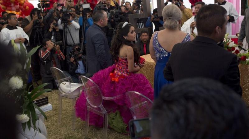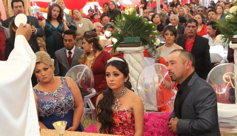 La carretera rumbo a Villa Guadalupe estaba minada de flechas rosas que indicaban el camino hacia la fiesta, mientras en los restaurantes aledaños, la gente interrumpía sus alimentos y enmudecía cuando aparecía en la televisión la misa en vivo de la quinceañera.