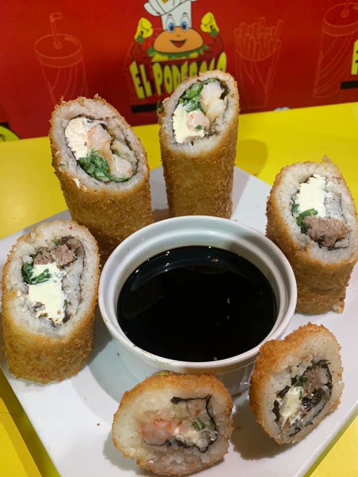 Por ahora solo cuentan con un solo tipo de roll, el cual está relleno mitad mechada, queso, cebollín y la otra con camarón. Todo eso envuelto en panko.
