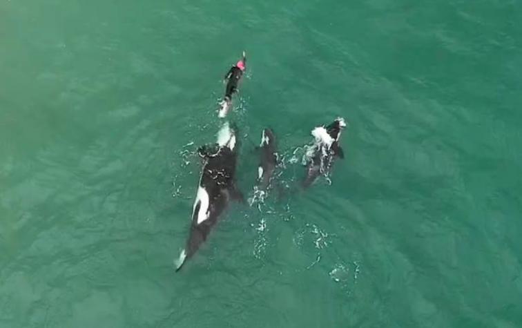 Dron graba el momento en el que una nadadora juega con una familia de orcas