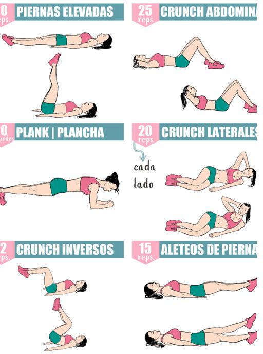 Aquí una rutina bastante completa como para empezar, ejercicio 1 20 rept, ejercicio 2 30 rept, ejercicio 3 plancha 30 seg, ejercicio 4 20 rept, ejercicio 5 12 rept, ejercicio 6 20 rept. / deben realizarse 6 series de cada ejercicio (siempre hidratándose).