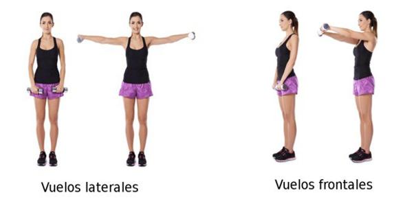 Ejercicios 1 y 2 hombros lateral y frontal, 4 series de 14 repeticiones para cada ejercicio (8 series en total)