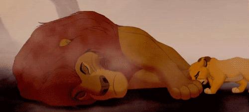 Debido al malvado plan de Scar, Mufasa, luego de salvar a Simba de la estampida, queda colgando de un precipicio con los animales aún corriendo bajo él. Es su propio hermano, Scar, quien lo arroja al vacío provocándole la muerte. Simba, desconsolado, no puede creer que su padre esté muerto.