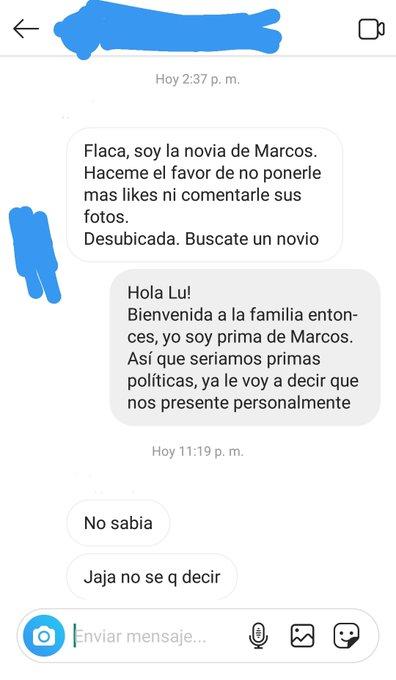 “Flaca, soy la novia de Marcos. Hazme el favor de no ponerle más likes ni comentarle sus fotos. Desubicada. Búscate un novio”, le escribió la mujer.