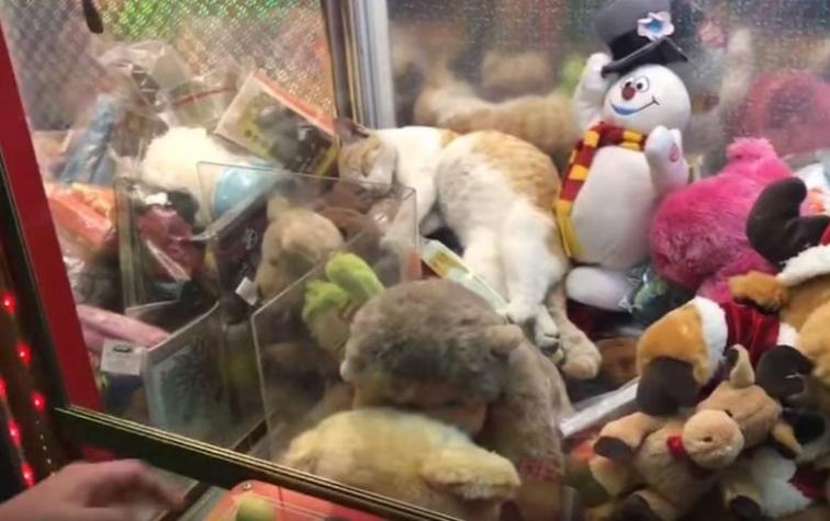 Sorprenden a un gato durmiendo dentro de una máquina de peluches