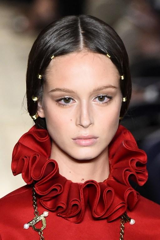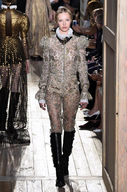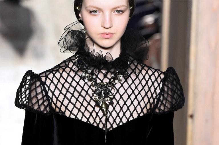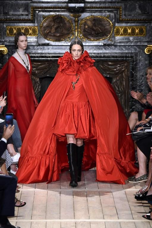 Volviendo a las pasarelas, el rojo Valentino no podía dejar de estar presente, y lo hizo con un traje de dos piezas que consistía en un vestido y capa, pero con unos dejos de modernidad al incorporar botas de cuero largas, sin dejar el toque clásico en gorgueras y hombreras.