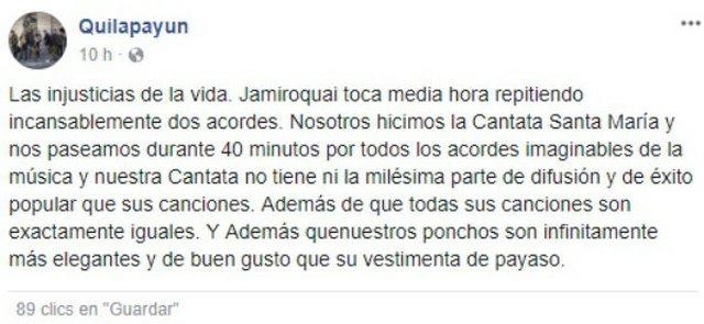 Tras el show de Jamiroquai, en la página de Facebook de la banda apareció un largo posteo, en el que se criticaba a la banda británica. “Jamiroquai toca media hora repitiendo incansablemente los acordes. Nosotros hicimos la cantata Santa María y no tiene ni la milésima parte de difusión y de éxito popular que sus canciones”, decía parte del texto, que fue blanco de críticas. “Además que nuestros ponchos son infinitamente más elegantes que su vestimenta de payaso”, agregaron. Si bien fue compartida más de 2.600 veces, los comentarios al posteo fueron una verdadera reprimenda a los músicos y al administrador del fanpage por su actitud resentida.