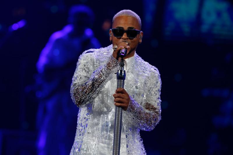 Ozuna optó por un outfit completamente blanco. Una de las cosas que más llamó la atención fue el impermeable con el que se paró sobre el escenario, el que daba una impresión a "cristal".