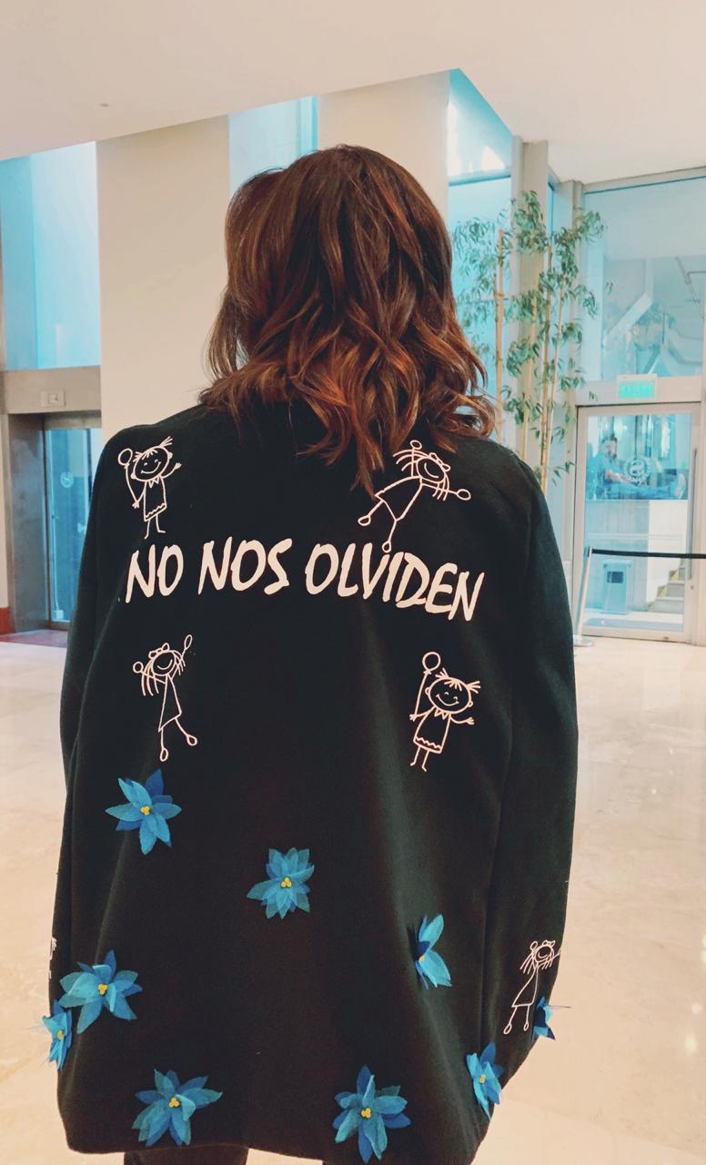 Para esto escogio un traje de dos piezas con un tapado encima con la frase “No nos olviden” y diferentes niños y flores dibujadas en él.