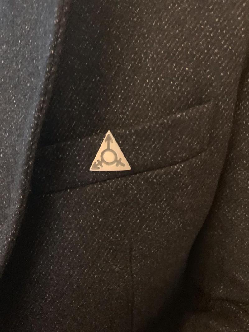 El detalle lo marca el “pin” que lleva en el costado izquierdo de su chaqueta.
