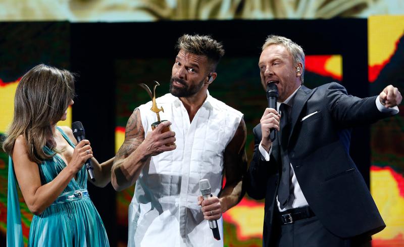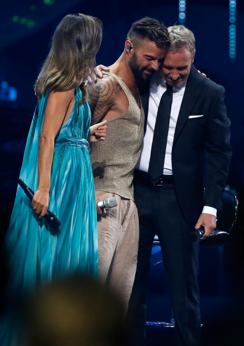 Luego de la primera canción Ricky dejó la camisa y su total look fue completamente brillante.