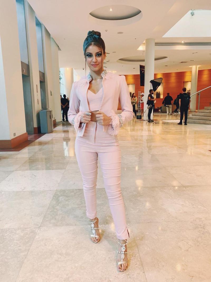 Esta vez Souza ocupa un traje de dos piezas, pantalón y top, en tonos rosado pastel.
