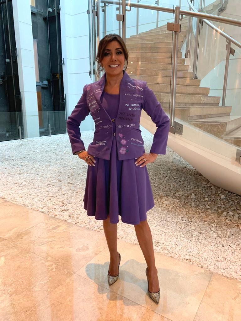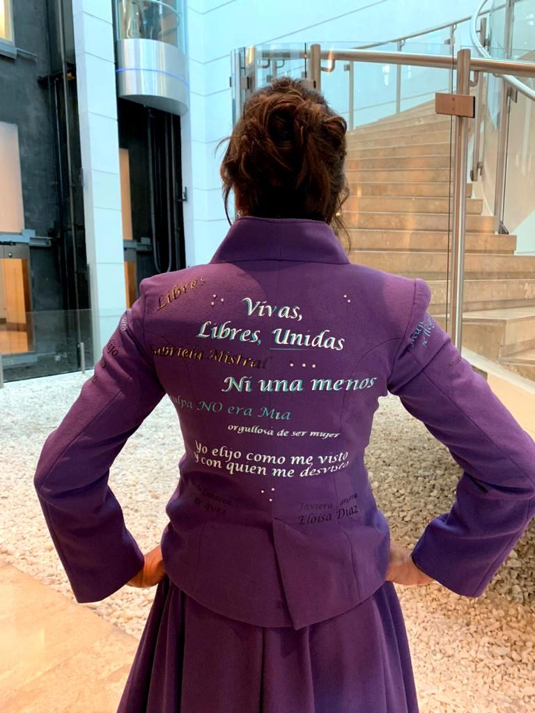 Es por esto que Carmen Gloria utiliza un traje totalmente morado, en el que incluyó diferentes frases feministas además de nombres de reconocidas mujeres nacionales.