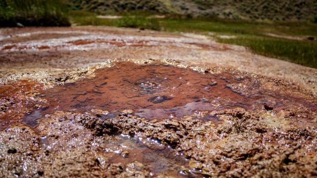 Esta primera parada del trekking es un oasis rojizo rodeado de suaves prados verdes, los cuales surgen gracias a pozones de aguas volcánicas cargadas de minerales. Pese a que su sabor es muy desagradable, el paisaje que surge gracias a ellas es mágico.