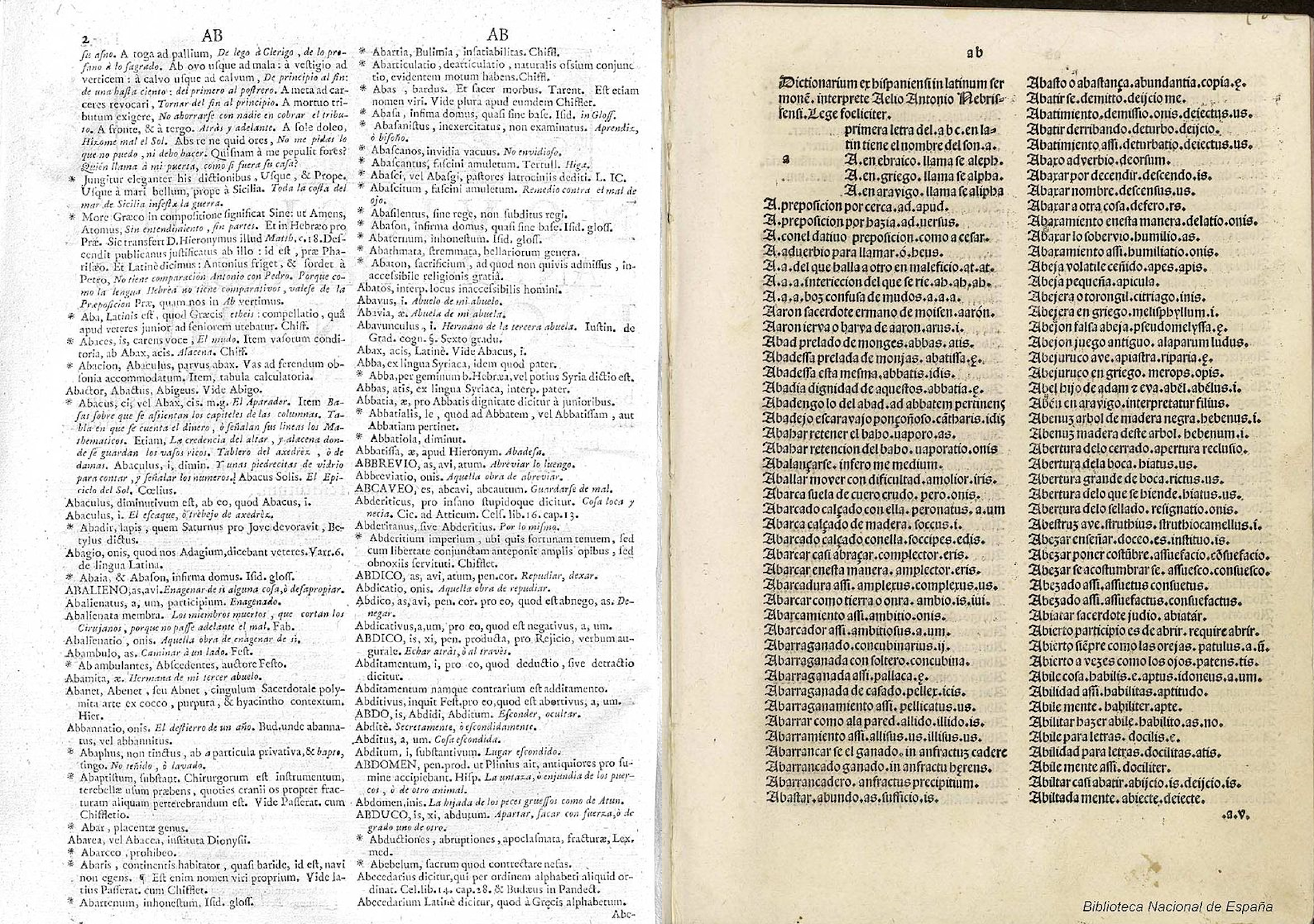 De mucho antes son el Diccionario latino-español (1492) y el Vocabulario español-latino (1495) de Antonio de Nebrija. Se trata de diccionarios bilingües que, eso sí, sientan las bases para que el español se separe por completo del latín y se establezca como lengua de cultura.