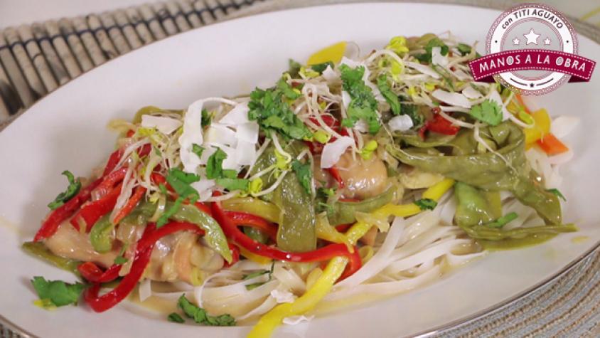 Para las verduras, picar 2 dientes de ajo, 1 cebolla en cuadrados medianos y cortar en tiras alargadas ½ pimentón verde, ½ pimentón rojo, ½ pimentón amarillo y 1 zanahoria. Pelar 1 trozo de jengibre con cuchara, picar ½ tallo de lemon grass, ajíes pequeños a gusto y brócoli a gusto. Una vez picados todos los ingredientes ponerlos en un wok con un poco de aceite de oliva, cocinar por 2 a 3 minutos y reservar.