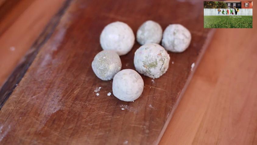 2.- Con ayuda de una cuchara o saca bocados, sacar pequeñas porciones y formar bolitas pasándolas por azúcar flor mezcladas con 2 cda de té matcha.