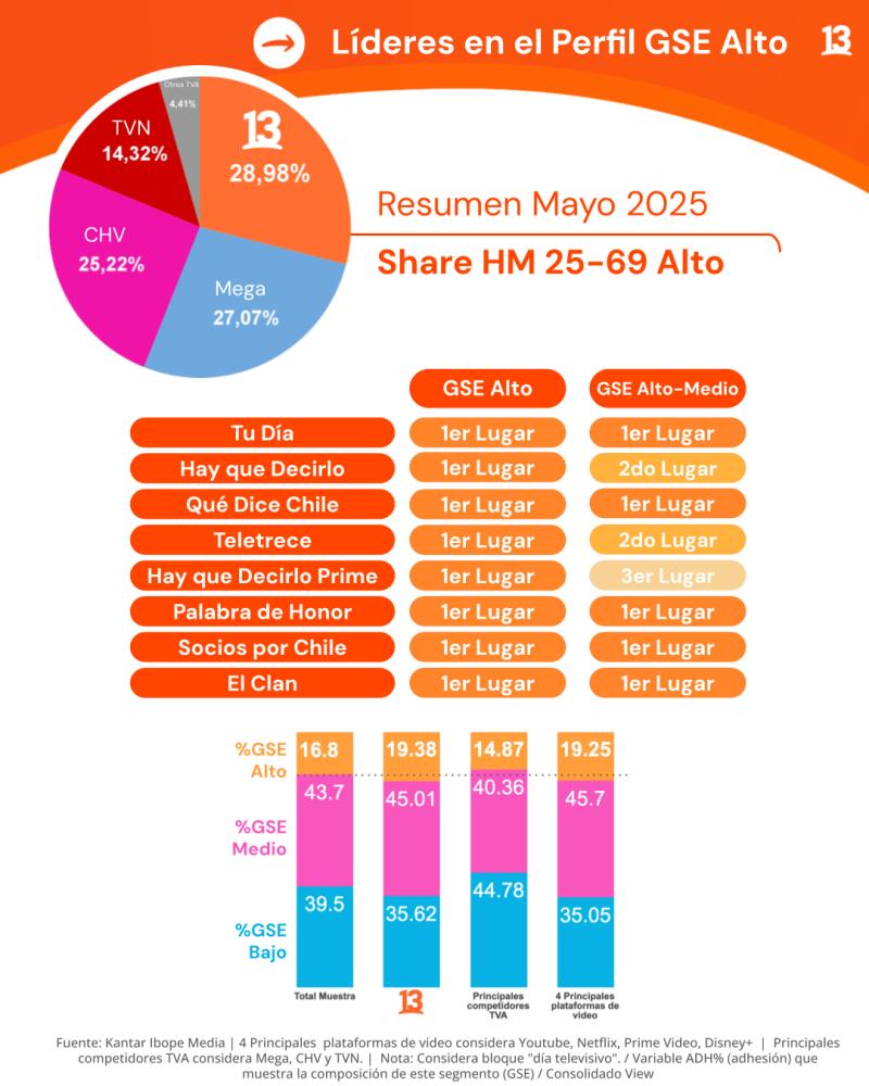 Además, el 13 se consolida como un actor protagónico y esencial en la industria mediática chilena, con un claro liderazgo en audiencias en el perfil socioeconómico alto. Por otro lado, ha escalado al segundo puesto en rating comercial (GSE Alto-Medio), con un alza sostenida desde febrero de 2025. Este crecimiento constante es un reflejo de la preferencia y fidelidad de la audiencia.