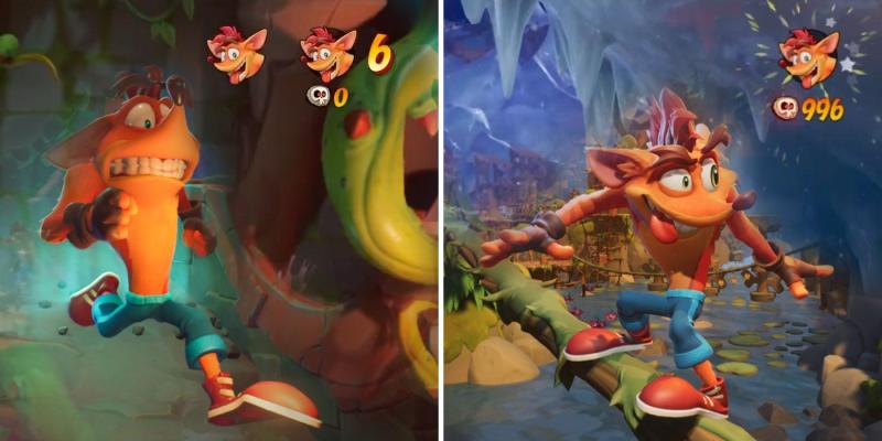 Crash Bandicoot 4 también te permite elegir entre un modo Retro o Moderno al comenzar tu partida. Como podrás suponer el modo Retro es la vieja escuela, el sistema que no sentía piedad por los sentimientos de los niños, teniendo que lidiar con vidas limitadas para terminar la aventura, mientras que el modo Moderno quita vidas de la ecuación y al morir solo caerás al último punto de control por el que hayas pasado, como dato curioso, el juego recomienda este último, que pese a ser más sencillo le quita cierto grado de entretención y satisfacción (o somos medio masoquistas). Algunas veces pasamos obstáculos de forma inexplicable y tras caer en un punto de control se nos aliviaba demasiado la tarea.