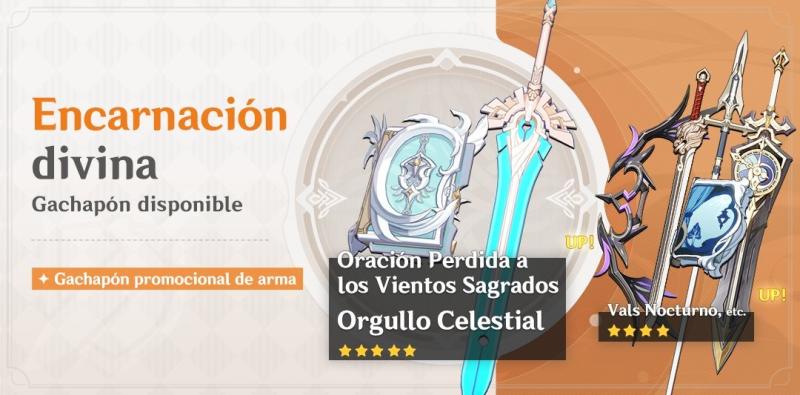 Por su parte, el banner de armas estará compuesto por dos armas 5 estrellas como lo son el Orgullo celestial y La Oración de los Vientos perdidos. En cuanto a armas de 4 estrellas estará el Vals Nocturno, Lanza de Favonius y Espada del Tiempo, entre otras.