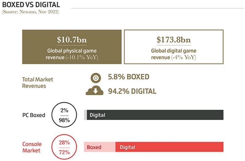 De hecho, siguiendo las estadísticas de la consultora Newzoo, los gamers de consola prefieren los títulos en físico más que los jugadores de PC, aunque sigue siendo bajo el porcentaje: un 28% de los juegos de consola vendidos en 2022 fueron físicos, mientra que en PC apenas llegaron al 2%.