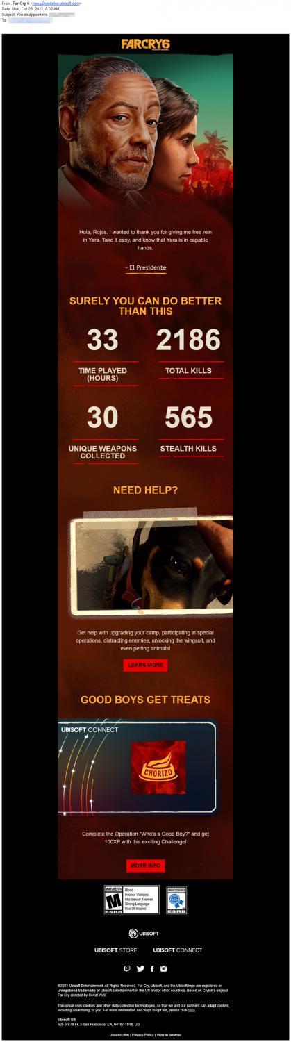 El mail en cuestión tiene como asunto “Me decepcionas” y un mensaje personalizado que pone “Hola, quería agradecerte que me hayas dejado libertad para reinar en Yara. Debes saber que está en buenas manos”, asegurando que “Ha sido divertido verte fallar” y agregando tus estadísticas de juego, agregando un “Seguro que puedes hacerlo mejor que esto”.