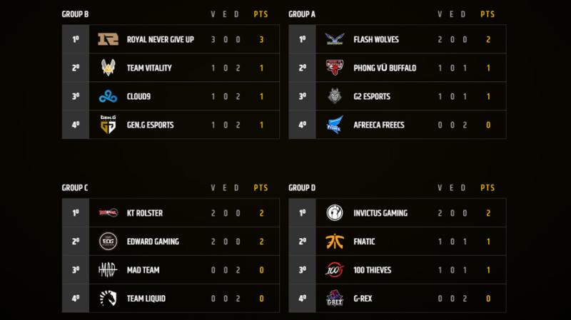 El domingo, el Grupo A nos ofrecerá tremendas partidas, con RNG con posibilidades de tomar un invicto de 6 puntos para mantenerse en lo alto absoluto y ver como Team Vitality, Cloud9 y Gen.G "se matan" por la clasificación.