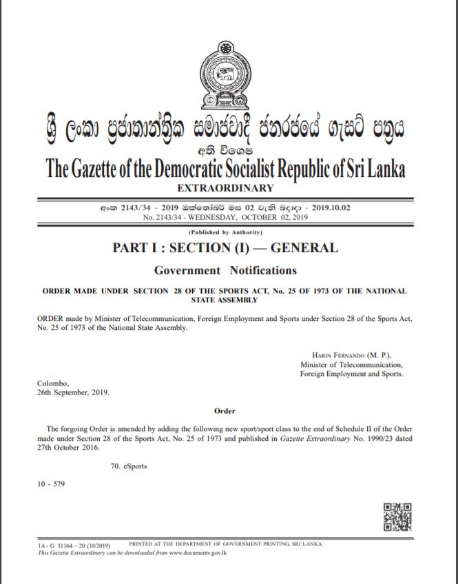 Sri Lanka se convirtió en el primer país del sur de Asia en incluir los esports como un deporte en su nación. La decisión fue tomada por el ministro de telecomunicación, empleo extranjero y deportes, Harin Fernandoy la orden fue presentada oficialmente bajo la sección 28 del acta de deportes No. 25 de 1973 de la Asamblea Nacional.